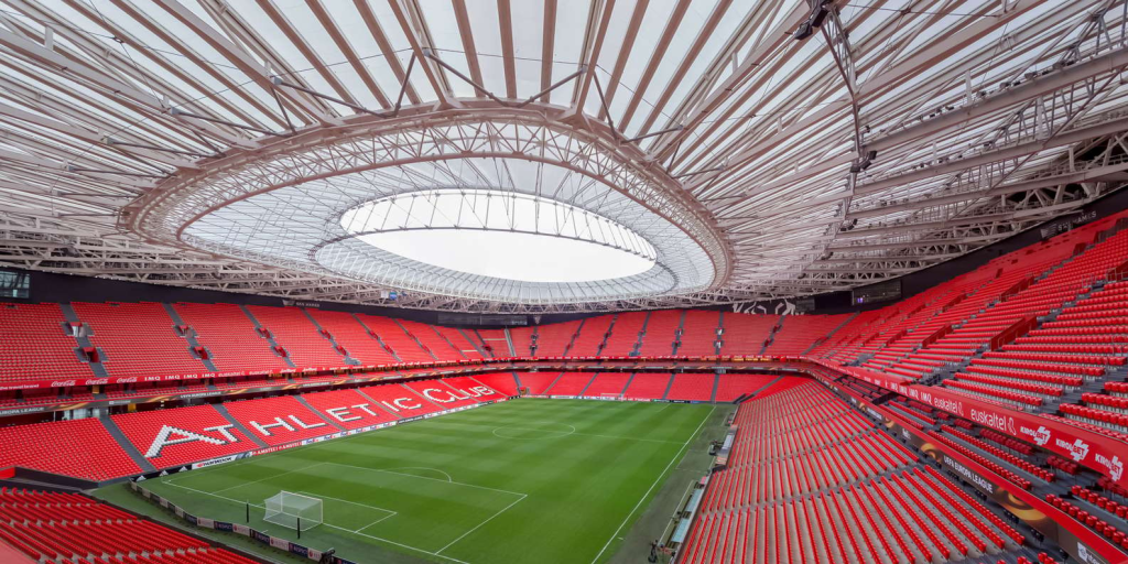 Дом клуба «Атлетик Бильбао» — один из самых узнаваемых стадионов Европы. Его форма напоминает гигантский барабан, а фасад подсвечивается в цветах команды.